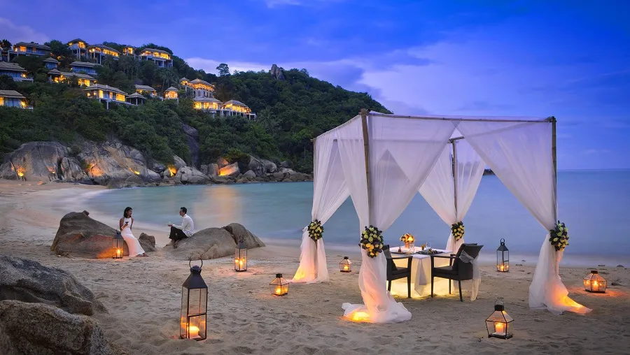 Sporting an intimate Wedding Deck, elevated high above the beach and commanding a spectacular view of the sapphire Andaman Sea, Banyan Tree Krabi is a dream-come-true location for those seeking a tropical beach wedding. The Wedding Deck is accessible by electric funicular, escorting guests to new heights above this stunning 5-star resort where all 72 rooms face the sea and the sunset, and each has its own infinity pool and plunge pool.The resort is surrounded by nature on three sides: a forested national park with stunning viewpoints to the north and east, and one of Thailand’s most iconic scenes – the uninhabited limestone cliffs of a the national marine park – to the west. Dining options include Afternoon Tea at the resort’s exotic Bird’s Nest tables, snuggled among the canopy of the trees. Banyan Tree Krabi also features Saffron, a fine-dining contemporary Thai restaurant, and an award-winning spa with the Banyan Tree brand’s signature Rainforest hydrotherapy experience.